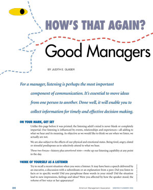 Try to recall a recent situation when you were a listener. It may have been a speech delivered by an executive, a discussion with a subordinate or an explanation from a peer. Did you listen to facts or to specific words? Did you paraphrase these words in your mind? Did the situation lead to new impressions, feelings and ideas? Were you affected by how the speaker stood, the volume of her voice or her appearance?