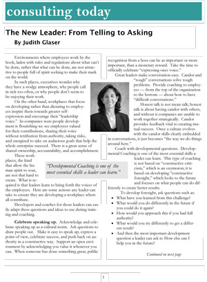 Some questions for the leader. To perpetuate growth of both the staff and the organization, the leader should be prepared to ask himself or herself some key questions every day, questions like: How do I shift from a telling leader to an asking one? What actions can I take to support a mentoring and coaching culture? How can I grow talent and the business at the same time? How can I make development part of everyone’s agenda?
